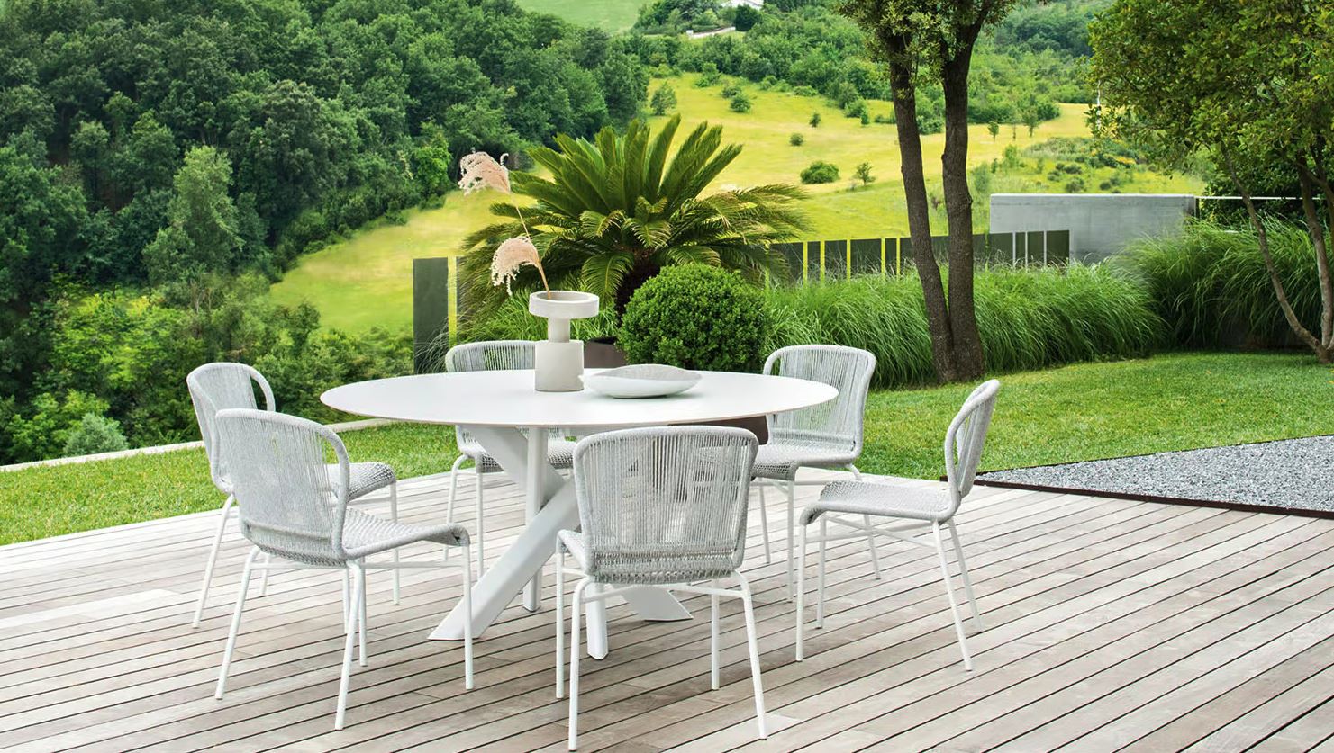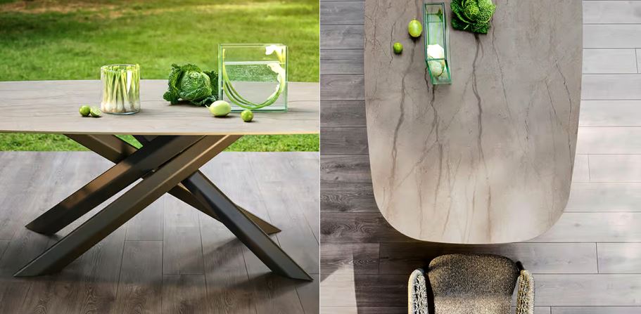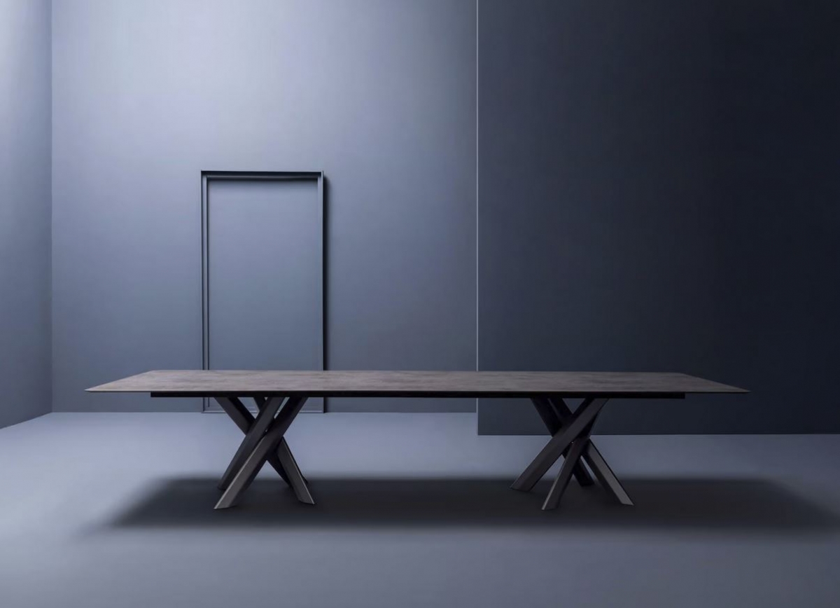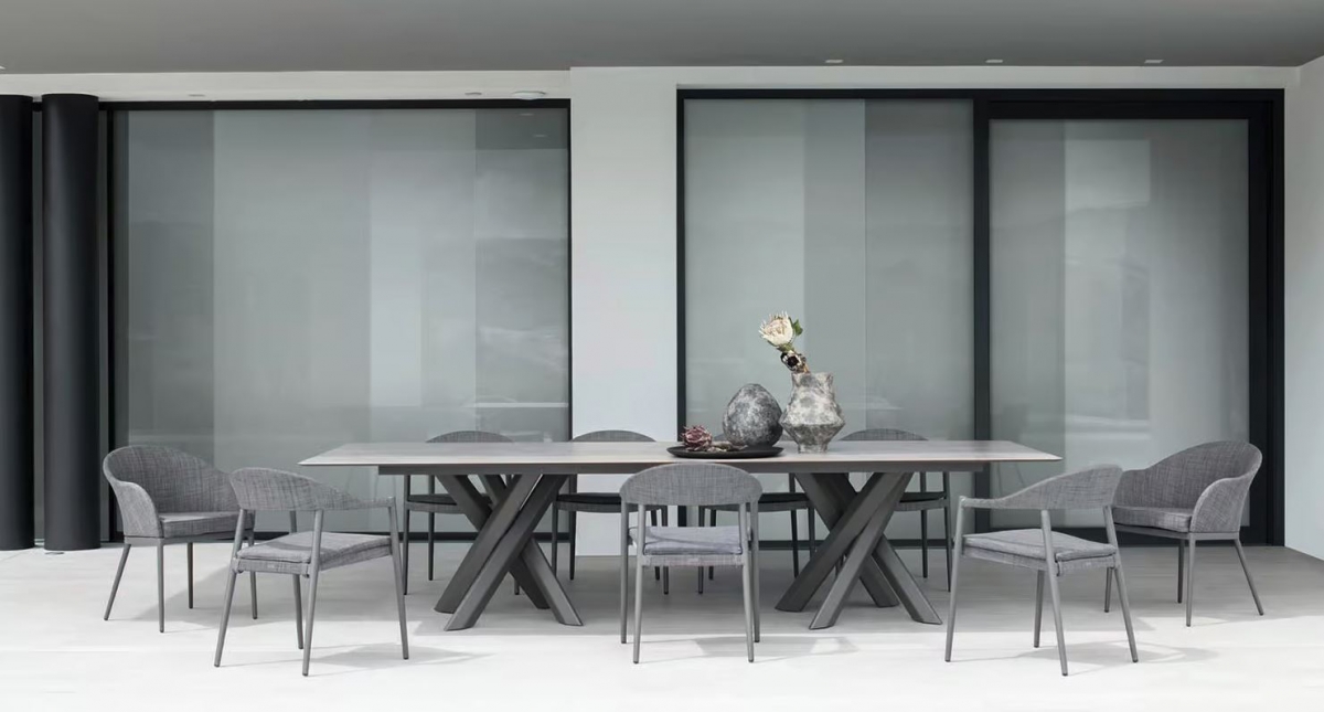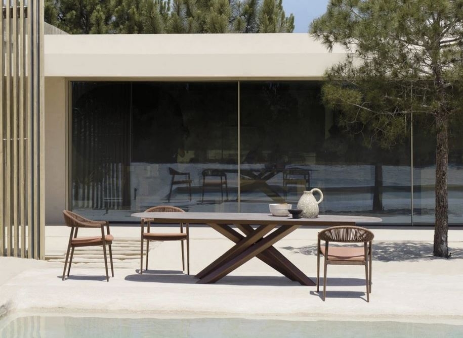 Romboidna oblika nog mize System Star se prepleta v igri linij kot zvezda . Lahkotna in značilna oblika podnožja tvori trdno podlago in pozdravlja različne vrste pravokotnih ali eliptičnih miznih plošč. Močna osebnost mize System Star daje eleganco in slog zunanjim prostorom, ki jih opremlja, in se v celoti izrazi tako v stanovanjskih kot poslovnih okoljih. Izvedba mize System Star Maxi vam omogoča družabnost. Velika mizna plošča je postavljena na dveh podnožjih, ki so značilne oblike te kolekcije.