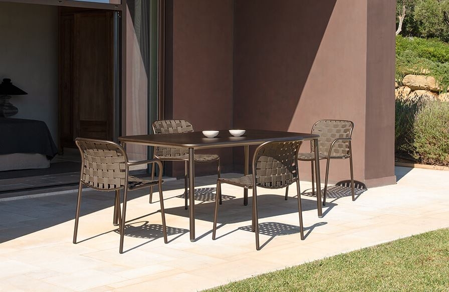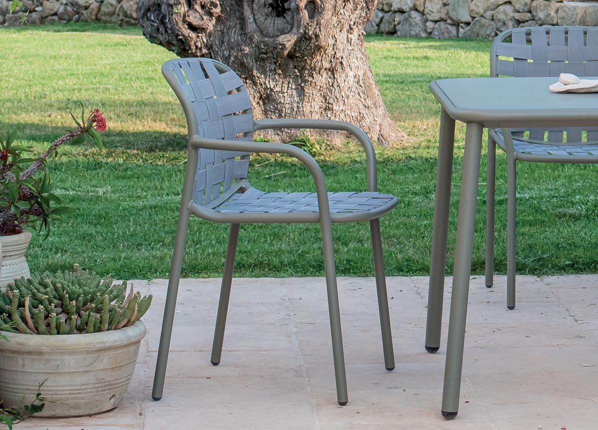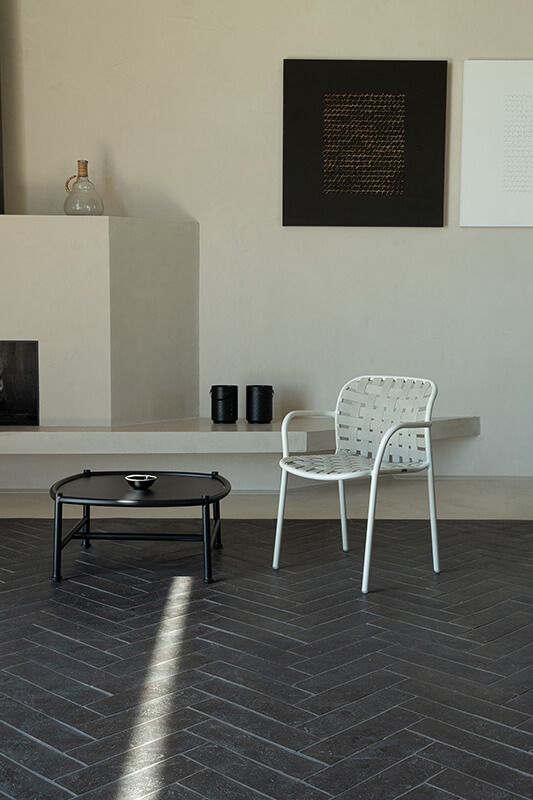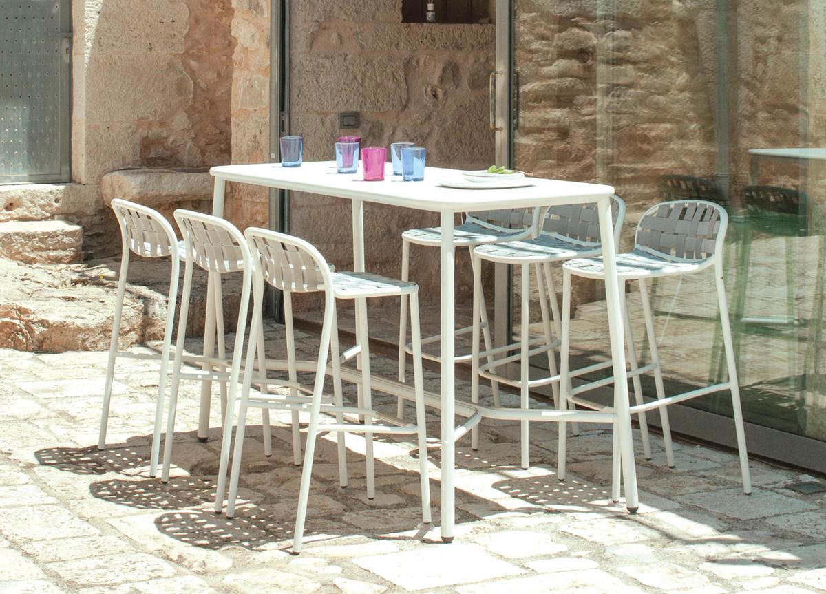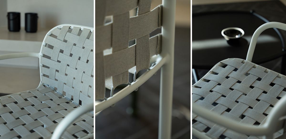Elastični trakovi iz tkanja, pritrjeni na prefinjen aluminijast okvir na inovativen način, dajejo življenje kolekciji, ki jo zaznamuje izjemen, eklektičen slog in vrhunsko udobje, popolnoma primerna za uporabo na prostem. Kolekcija Yard je izdelana iz trakov 100 % akrila, ki vsebujejo 50 % recikliranih vlaken, kar zagotavlja dolgo življenjsko dobo in vzdržljivost izdelka. Na voljo je v obsežni barvni paleti, sistem za pritrditev na lahek aluminijast okvir pa je zasnovan v skladu z estetiko izdelka.