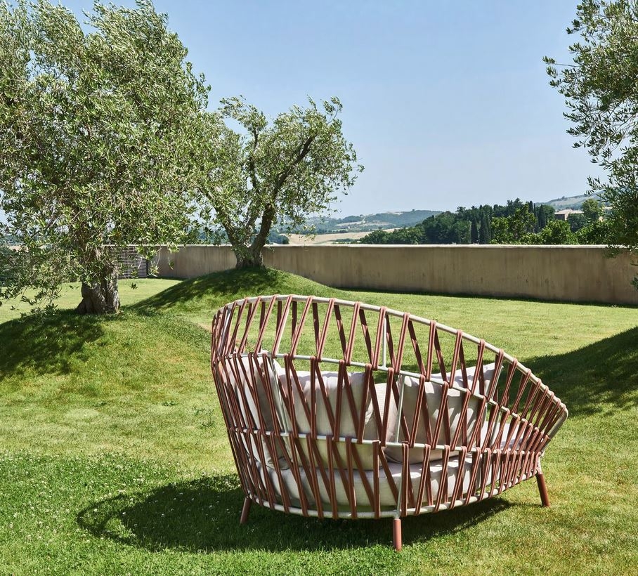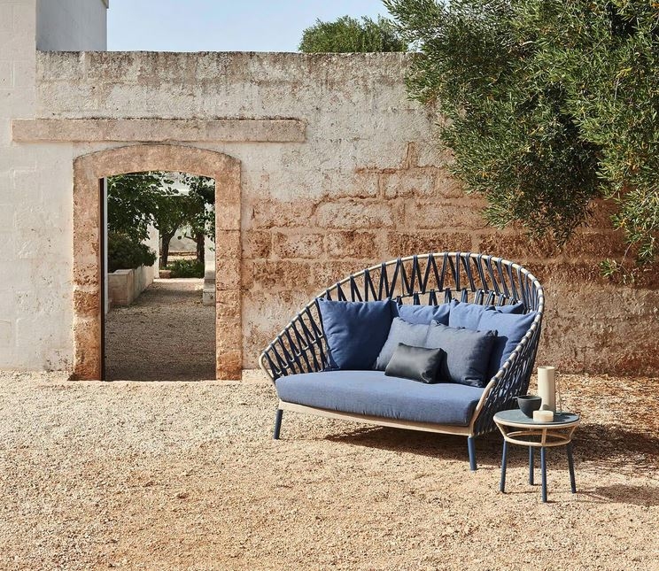 Vrtna postelja iz kolekcije Emma Cross, izstopa po svoji obliki, ki je izrazita zaradi kombinacije naslonjala in naslonov za roke. Odlikuje jo ročno izdelano tkanje iz akrilne tkanine, na prašno barvanem aluminijastem okvirju. Zaradi uporabe kakovostnih materialov je garnitura odporna na vodo, vlago in bledenje, hkrati pa enostavna za vzdrževanje. Idealna je za vrtove, terase ali ob bazenu.