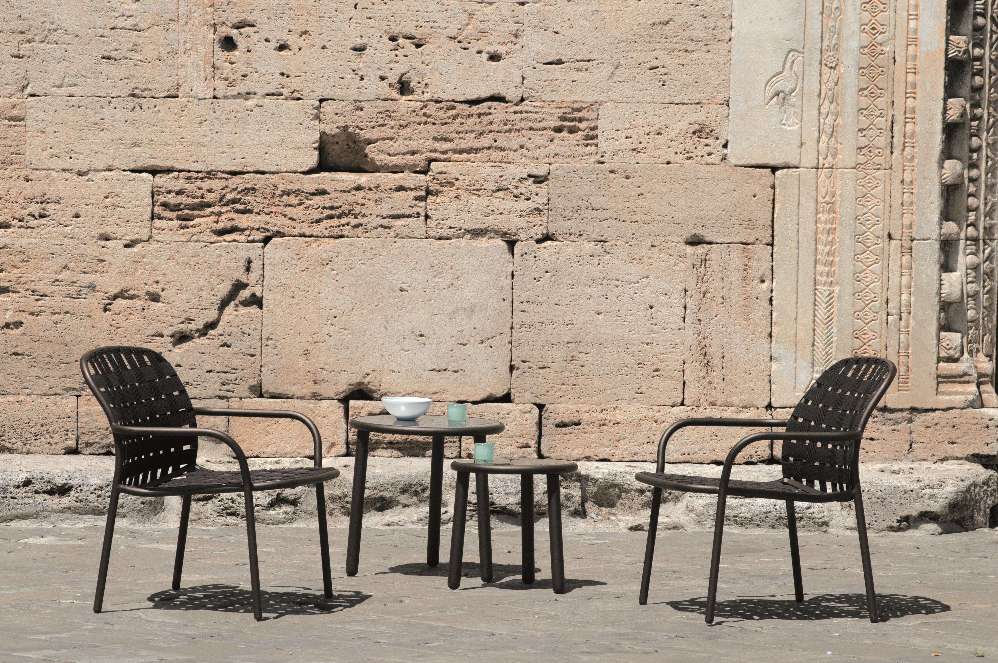 Elastični trakovi iz tkanja, pritrjeni na prefinjen aluminijast okvir na inovativen način, dajejo življenje kolekciji, ki jo zaznamuje izjemen, eklektičen slog in vrhunsko udobje, popolnoma primerna za uporabo na prostem. Kolekcija Yard je izdelana iz trakov 100 % akrila, ki vsebujejo 50 % recikliranih vlaken, kar zagotavlja dolgo življenjsko dobo in vzdržljivost izdelka. Na voljo je v obsežni barvni paleti, sistem za pritrditev na lahek aluminijast okvir pa je zasnovan v skladu z estetiko izdelka.