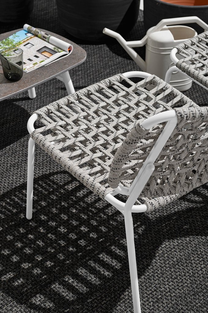 Vrtna sedežna garnitura YO! je sinonim za eleganco. Ima odstranljive sedalne in hrbtne blazine ter cevast kovinski okvir, ki je obdelan in prevlečen za uporabo na prostem. Sedežne blazine so nameščene na letveni podlagi, ojačani s polipropilenom in polnjene s poliuretansko peno, zaščiteno z vodotesno PVC podlogo in prevlečen z vodoodbojno tkanino Sunbrella® z značilnostmi za uporabo na prostem. Tkanina nudi posebno zaščito pred UV sončno svetlobo in je odporna proti bledenju ter proti plesni in madežem. Garnitura Yo! zajema 2 sed, 3 sed in počivalnik. Rokonaslon je prepleten s sintetično vrvjo Tortuga. Tortuga je pralna sintetična preja z notranjim ojačitvenim jedrom. Zasnovana za uporabo na prostem, je odporna na UV žarke, plesen in obrabo.