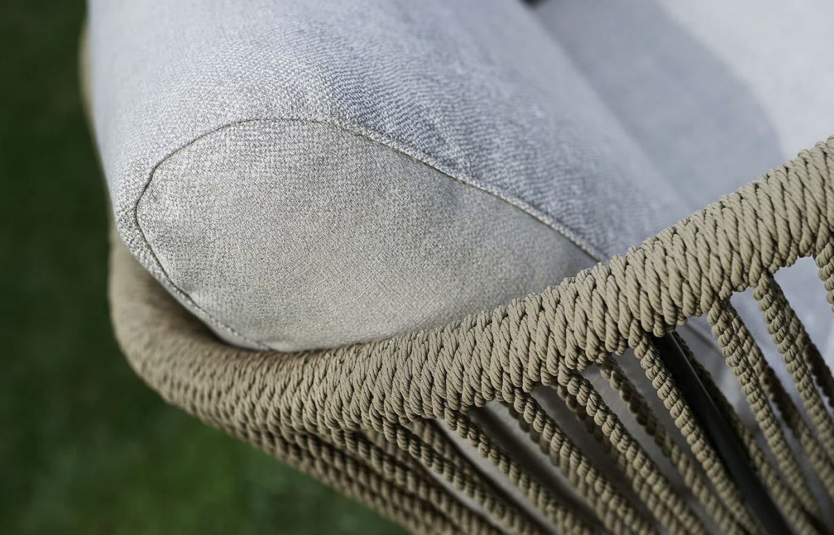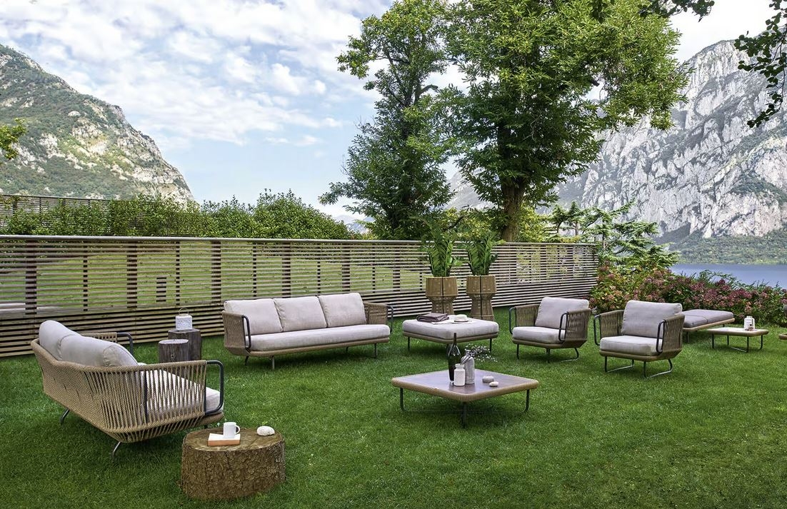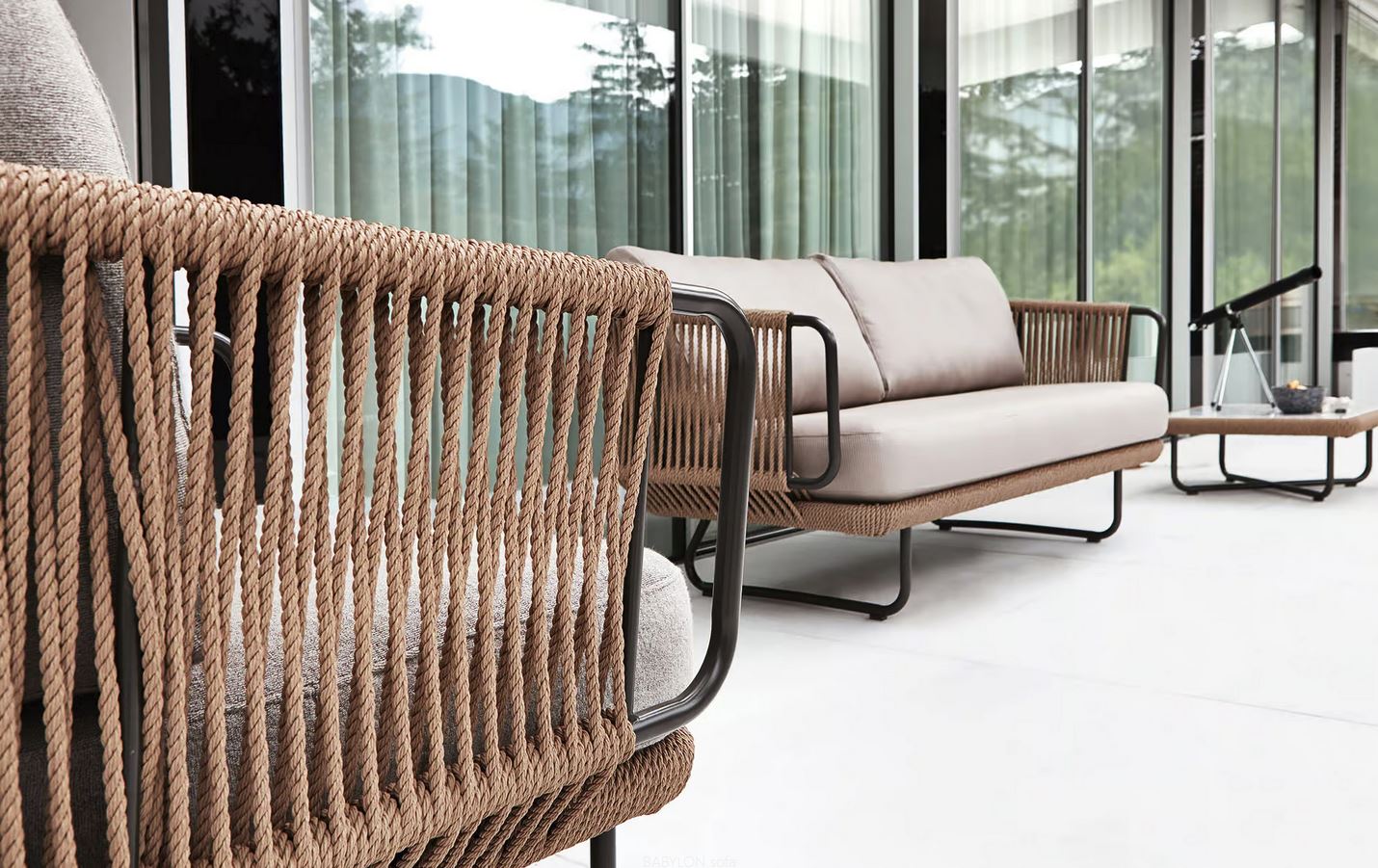 Vrtna garnitura Babylon ima robustno konstrukcijo iz barvanega aluminija, na katero je v enakomernih presledkih vtkana sintetična konopljina vrv, zaradi česar je profil hrbtišča dinamičen in zračen. Na voljo je kod dvo in trosed, ter lounge fotelj, ki se usklajujejo z naravnimi barvami zunanjih prostorov, ki jih opremljajo, od terase hiše do zunanjega dela in ustvarja popolno vzdušje za sprostitev na prostem.